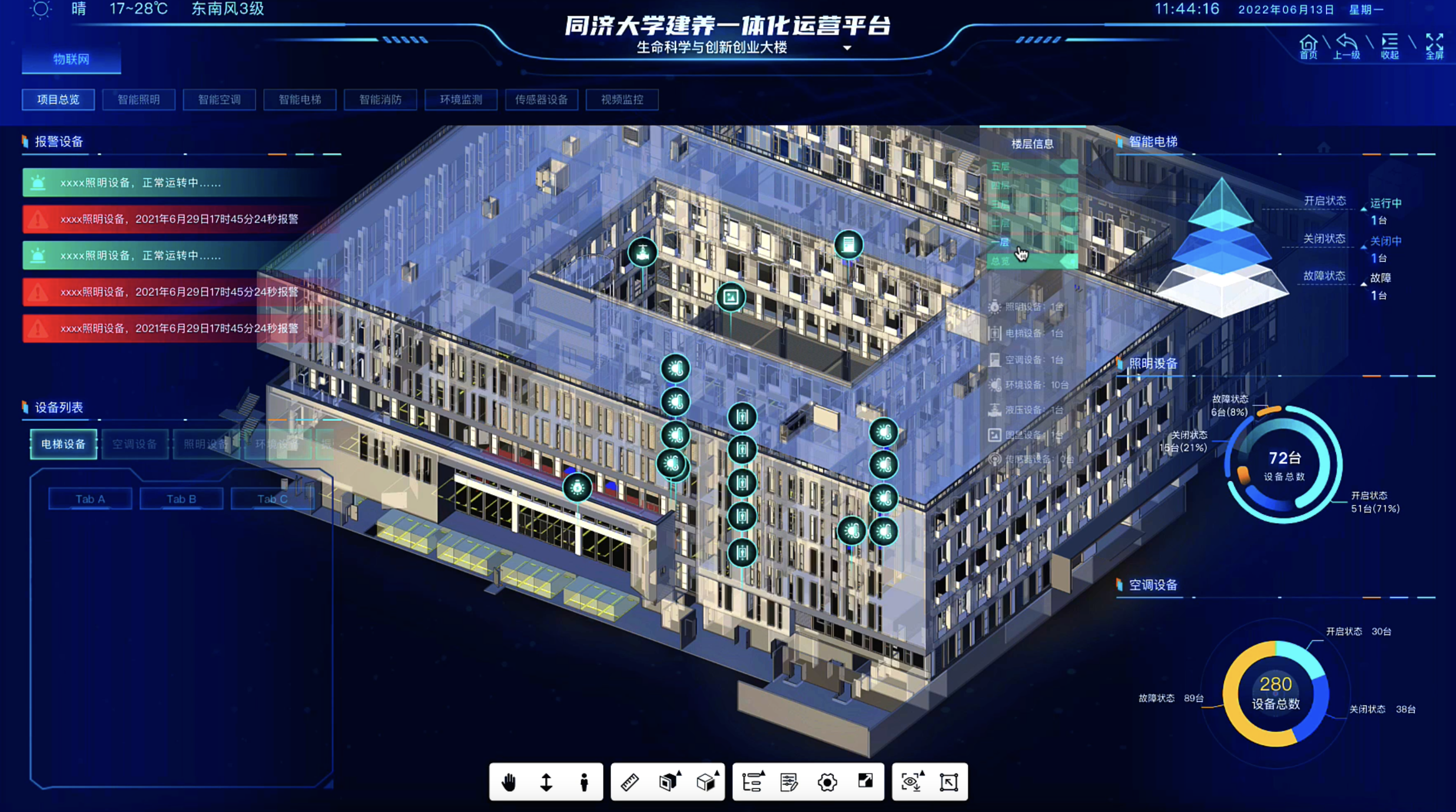 以竣工BIM模型为底座,将传统运维管理数据与智能化设备系统集成,实现三维可视化大数据驾驶舱。通过BIM模型定位设备位置,并实施监控所有设备运行状态,积累历史数据,并自动报警辅助快速巡检维修。各个业务板块通过平台运维管理单元模块统计管理相关数据,真正实现全方位无死角的智能化运维管理。