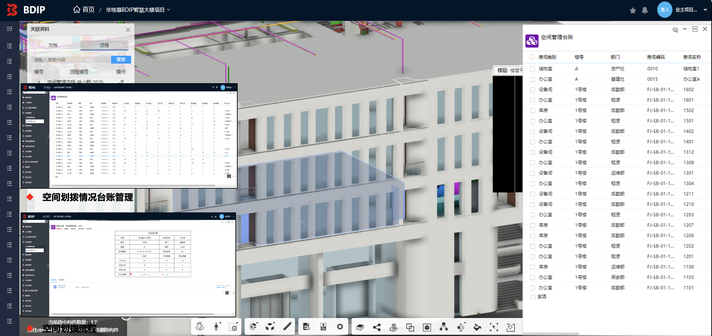 办公楼租售登记后,与BIM模型关联辅助定位,并可以直接查看调阅各种相关资料及合同文件,实景照片,并设定提醒,辅助业主提前进行招商计划。