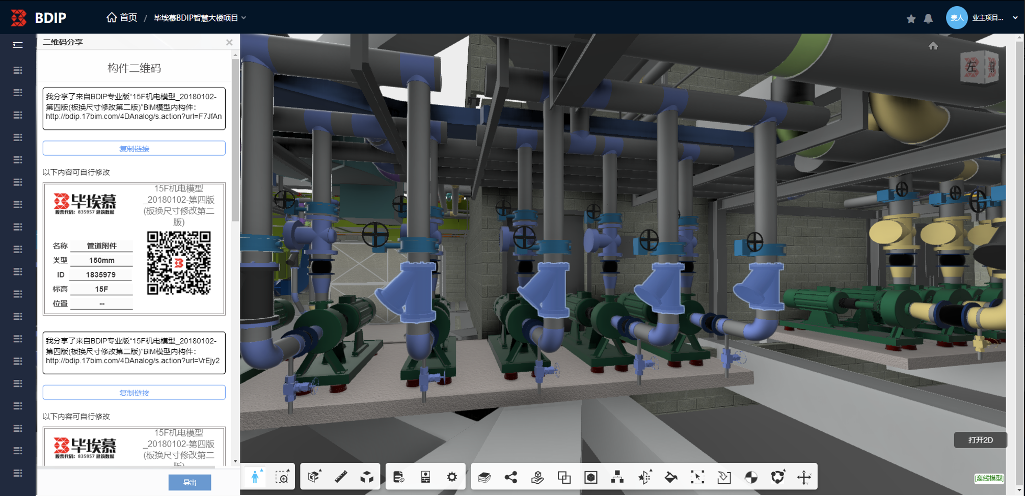 BDIP系统支持模型构件和视点批量生成二维码和分享链接,既可以通过链接发送给项目参与人员进行快速定位分享,也可以通过二维码打印粘贴在现场对应位置,方便现场管理人员扫码快速查看BIM模型。