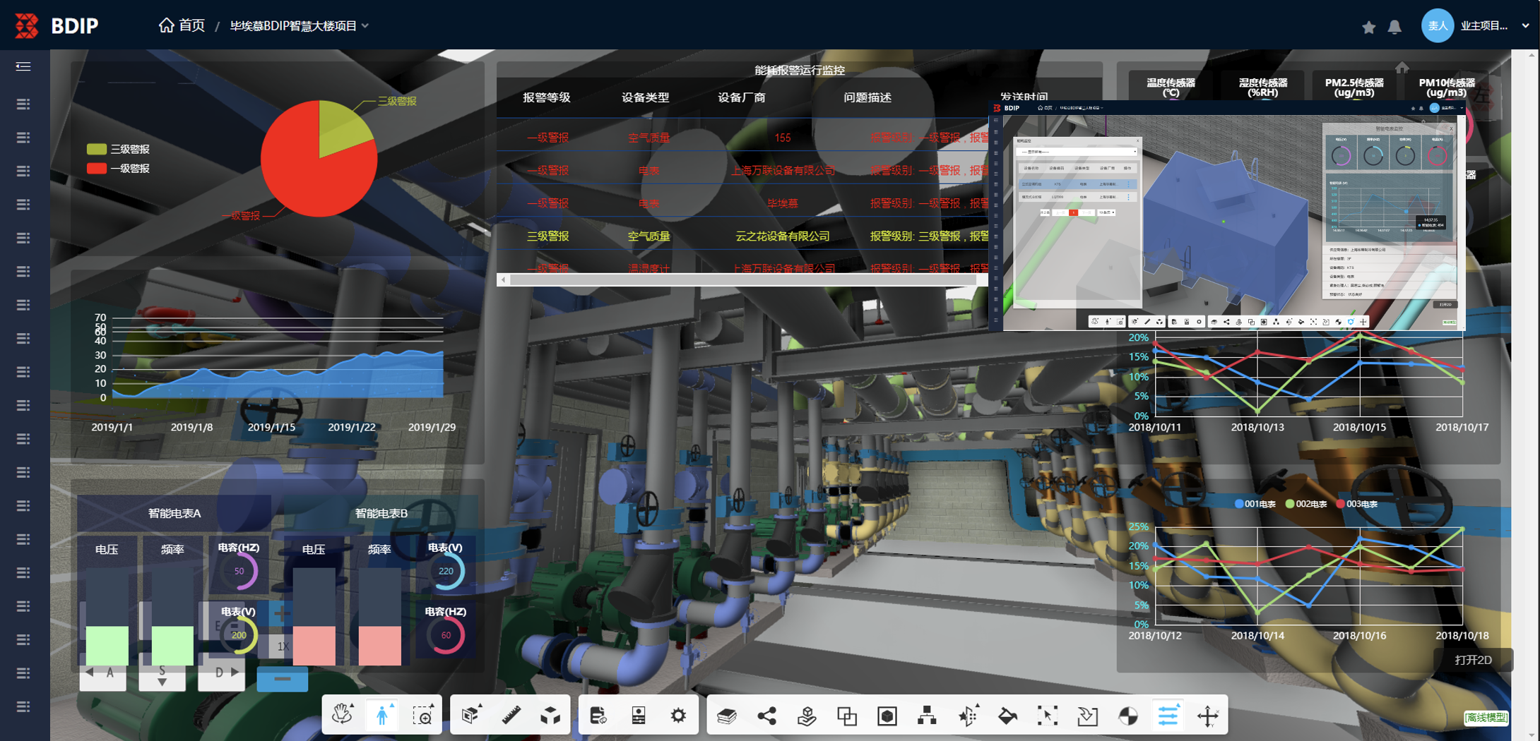 BDIP支持物联网集成,现场各种监测设备与BIM模型一一对应,点击单个构件即可调取查看实时检测状态和数据,所有数据可集成成数据分析图表直接展示。通过设置警戒值,自动进行报警,通过手机、邮件推送提醒,确保现场安全。